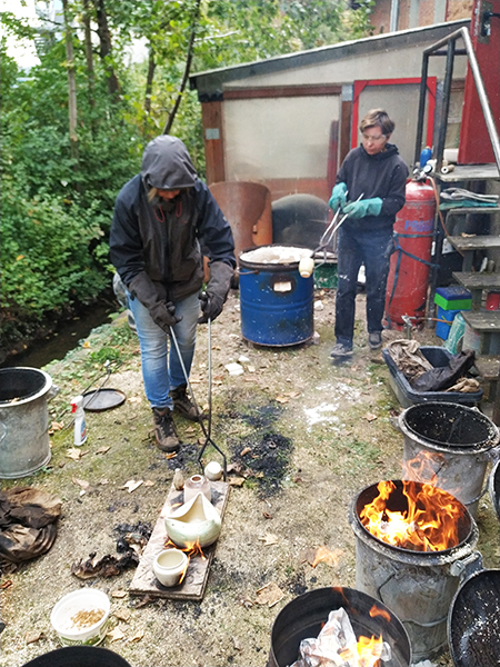 Die japanische Raku-Brenntechnik fasziniert seit Jahrhunderten Menschen auf der ganzen Welt. Das glasierte oder unglasierte, geschrühte Keramikobjekt wird dem Ofen bei etwa 1000 Grad glühend entnommen und in einem Behälter mit organischem Brennstoff (Laub, Stroh, Heu etc.) luftdicht eingebettet. Der entstehende Rauch (Kohlenstoff), der Sauerstoffentzug sowie die im Laub enthaltenen Mineralien wirken stark auf den Tonscherben und die Glasurfarben ein. Die Ergebnisse überraschen mit spannenden Oberflächen. Der Brennverlauf lässt sich beim Rakubrand nur bedingt steuern, sodass jedes Stück ein unnachahmliches Unikat ist.